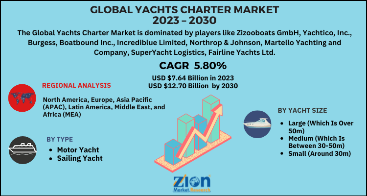 According to the report published by Zion Market Research, the global Yachts Charter Market size was valued at USD 7.64 Billion in 2023 and is predicted to reach USD 12.70 Billion by the end of 2032. The market is expected to grow with a CAGR of 5.80% during the forecast period. The report analyzes the global Yachts Charter Market’s growth drivers, restraints, and impact on demand during the forecast period. It will also help navigate and explore the arising opportunities in the Yachts Charter Market industry.